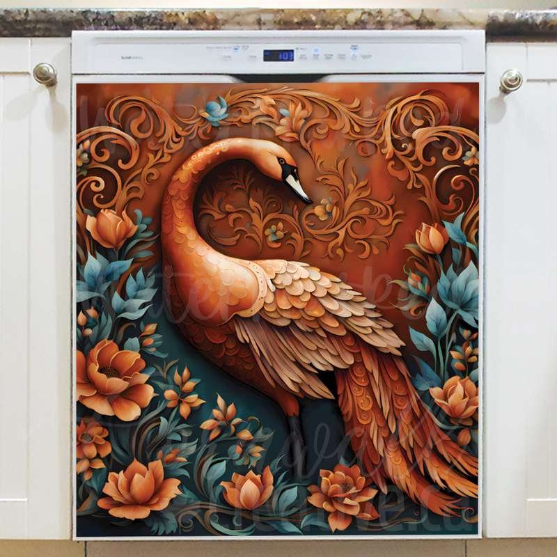Tooled Leather Swan Design Magnetic Dishwasher Door Cover