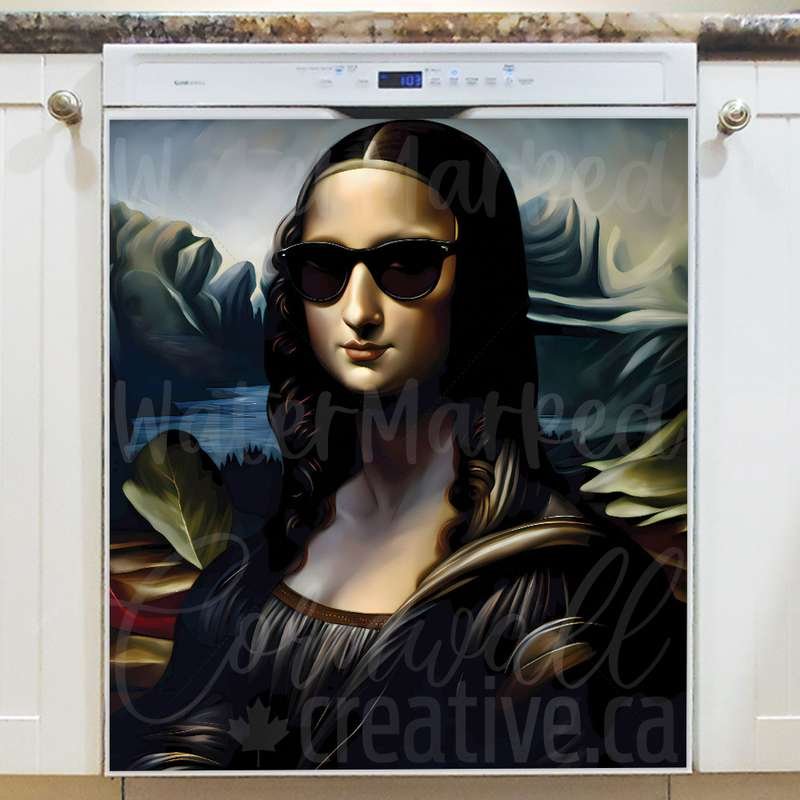 Embellish your kitchen effortlessly with this stunning Mona Lisa in Sunglasses and Leather Coat Magnetic Dishwasher Door Cover! Keep in mind that while this cover works with most dishwashers, some stainless steel and plastic doors might not hold magnets. There are two types of stainless steel: one that attracts magnets well and another that does not, and plastic doors will definitely not work with magnets. So, it is a good idea to test the surface with a magnet before making a purchase. If your dishwasher door is not compatible, consider opting for the Removable Dishwasher Door Sticker instead. Your developed kitchen will be ready for the season in no time! Keep in mind that this magnetic cover is versatile and can be used on a variety of appliances, including fridges, freezers, washers, dryers, and more!