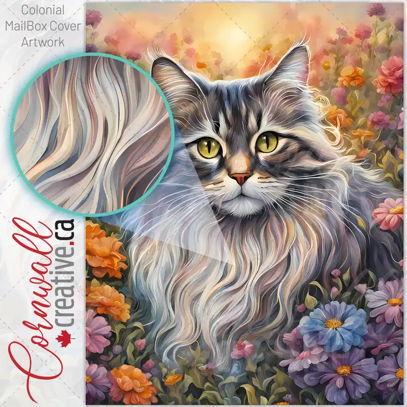 Grey Sphinx Cat and Pink Flowers Colonial Mailbox Cover