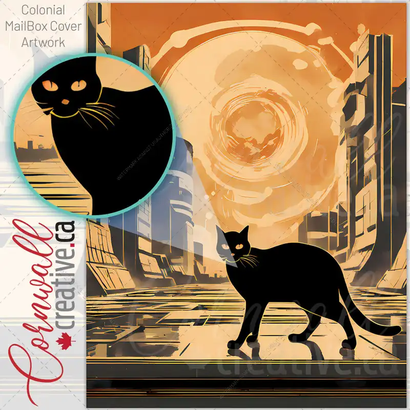 Retro Atomic Black Cat in the City Colonial Mailbox Cover