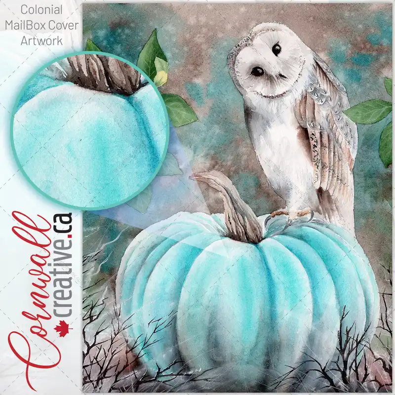 Cute Barn Owl Sitting on a Blue Pumpkin Colonial Mailbox Cover