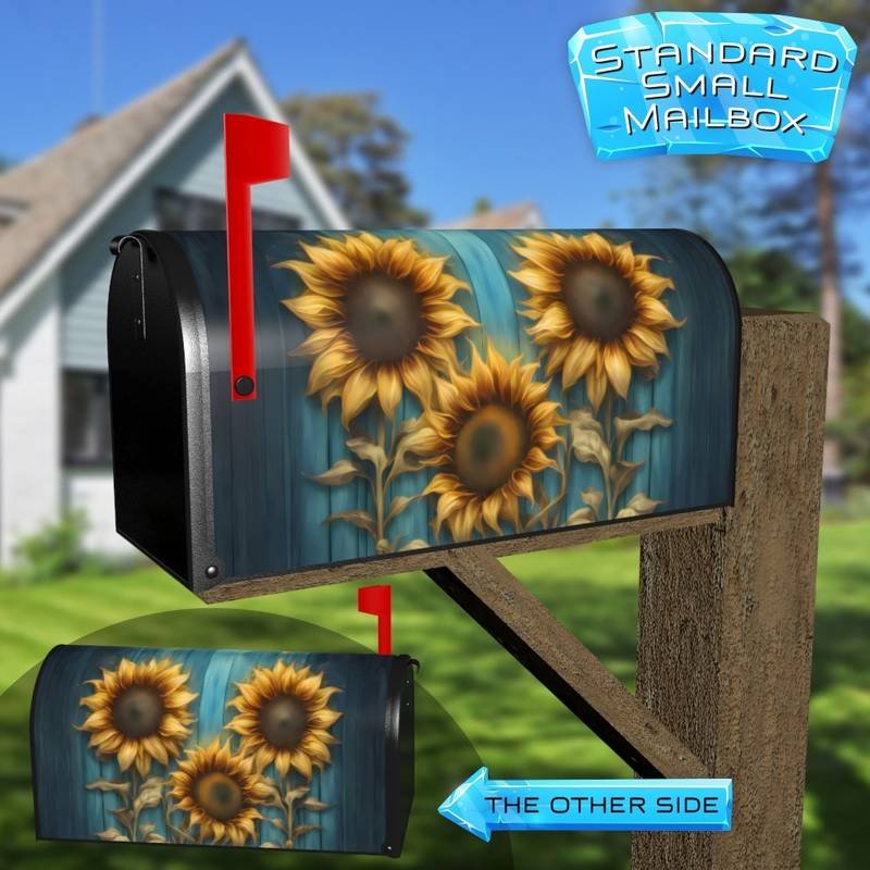 Rustic Blue Wood and Sunflowers Rural Farm Mailbox Cover