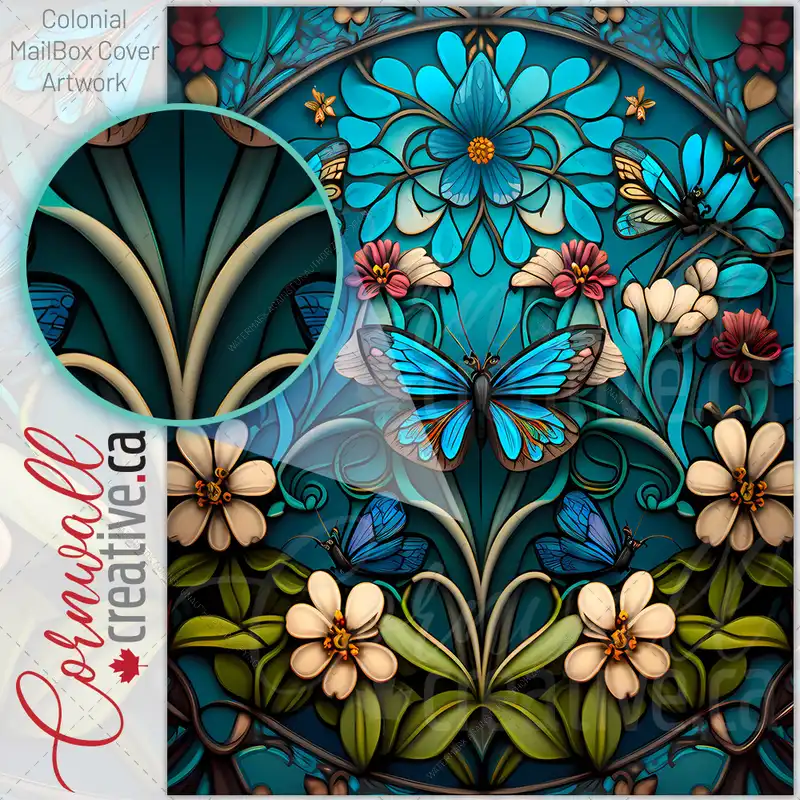 Stained Glass Blue Butterfly Design Colonial Mailbox Cover