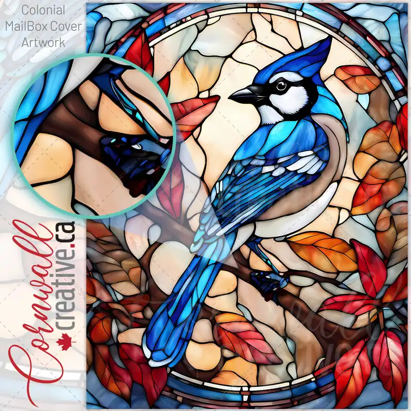 Stained Glass Blue Jay Design Colonial Mailbox Cover