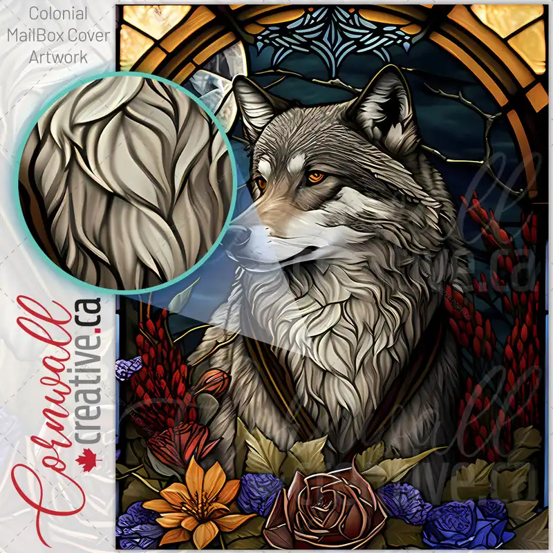 Stained Glass Wolf and Flowers Design Colonial Mailbox Cover
