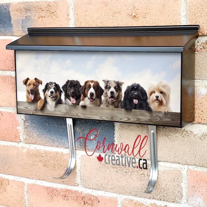 Applying your A Group Of Dogs Are On A Wooden Fence 3 wall-mounted townhouse / ranch mailbox cover it is pretty easy to revamp your mailbox to a special and unique item. These covers require a flat surface, so they work with townhouse / ranch mailboxes that do not have any embossed / debossed decoration or signs. Magnetic mailbox covers work with steel boxes only, for aluminum and plastic boxes we offer the self-adhesive vinyl covers. Also, you can create your custom townhouse / ranch mailbox cover using you own pictures, adding your name, street number, etc. Our magnetic covers feature a complete magnetic surface throughout the entire design, unlike lower-quality options that only incorporate two magnet strips combined with a piece of canvas. This ensures better functionality and a more reliable, stronger hold against the wind, also these covers have an additional UV protection, so your covers will not fade for many years. The reflective mailbox covers function just like license plates and road signs, ensuring excellent visibility during nighttime.