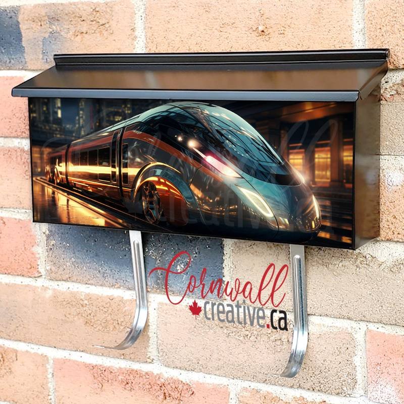 Applying your A High Speed Ultramodern Train Rides On Rails wall-mounted townhouse / ranch mailbox cover it is pretty easy to develop your mailbox to a special and unique item. These covers require a flat surface, so they work with townhouse / ranch mailboxes that do not have any embossed / debossed decoration or signs. Magnetic mailbox covers work with steel boxes only, for aluminum and plastic boxes we offer the self-adhesive vinyl covers. Also, you can create your custom townhouse / ranch mailbox cover using you own pictures, adding your name, street number, etc. Our magnetic covers feature a complete magnetic surface throughout the entire design, unlike lower-quality options that only incorporate two magnet strips combined with a piece of canvas. This ensures better functionality and a more reliable, stronger hold against the wind, also these covers have an additional UV protection, so your covers will not fade for many years. The reflective mailbox covers function just like license plates and road signs, ensuring excellent visibility during nighttime.