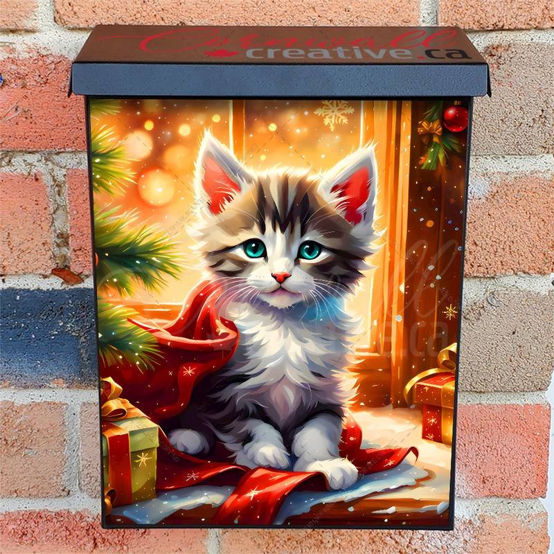 Gild your Mailbox and your neighborhood with this brilliant A Kitten for Christmas Colonial magnetic or self adhesive vinyl Mailbox Cover. Our magnetic covers feature a complete magnetic surface throughout the entire design, unlike lower-quality options that only incorporate two magnet strips combined with a piece of canvas. This ensures better functionality and a more reliable, stronger hold against the wind, also these covers have an additional UV protection, so your covers will not fade for many years. We offer self-adhesive and magnetic covers with both standard opaque vinyl or reflective vinyl options. The reflective mailbox covers function just like license plates and road signs, ensuring excellent visibility during nighttime. No matter the size of your mailbox, we make covers for all box sizes to suit your needs perfectly!