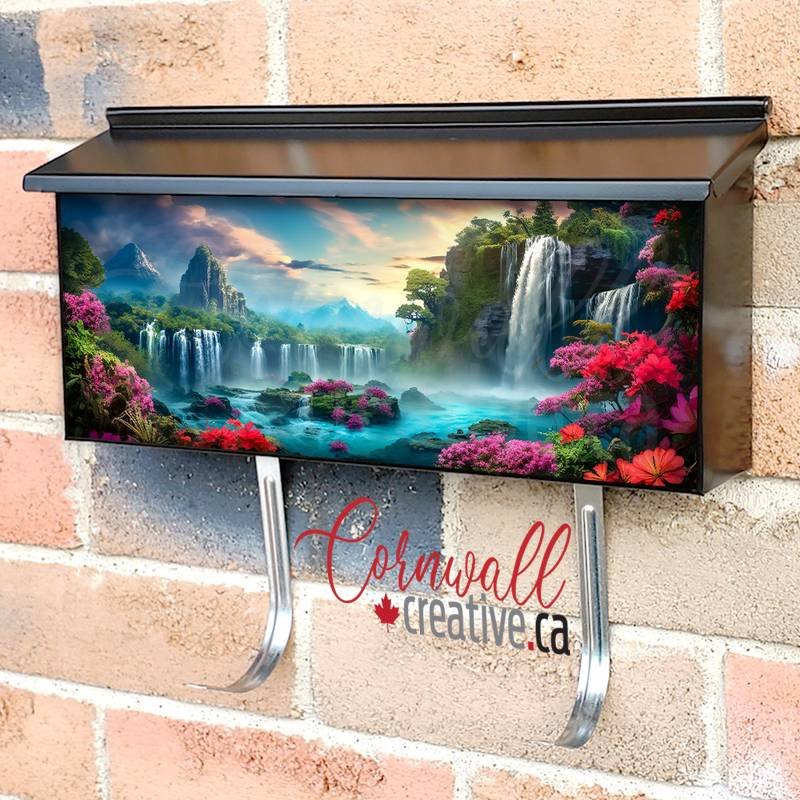 Applying your A Magical Waterfall In A Wonderfully Fantastic Flowering wall-mounted townhouse / ranch mailbox cover it is pretty easy to glamorize your mailbox to a special and unique item. These covers require a flat surface, so they work with townhouse / ranch mailboxes that do not have any embossed / debossed decoration or signs. Magnetic mailbox covers work with steel boxes only, for aluminum and plastic boxes we offer the self-adhesive vinyl covers. Also, you can create your custom townhouse / ranch mailbox cover using you own pictures, adding your name, street number, etc. Our magnetic covers feature a complete magnetic surface throughout the entire design, unlike lower-quality options that only incorporate two magnet strips combined with a piece of canvas. This ensures better functionality and a more reliable, stronger hold against the wind, also these covers have an additional UV protection, so your covers will not fade for many years. The reflective mailbox covers function just like license plates and road signs, ensuring excellent visibility during nighttime.