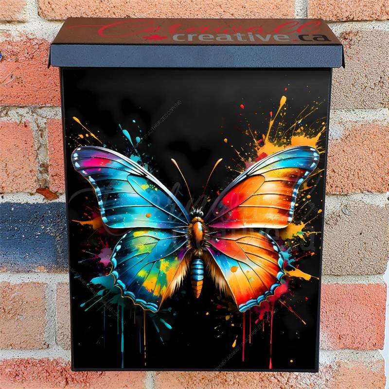 Embellish your Mailbox and your neighborhood with this brilliant Abstract Midnight Butterfly Colonial magnetic or self adhesive vinyl Mailbox Cover. Our magnetic covers feature a complete magnetic surface throughout the entire design, unlike lower-quality options that only incorporate two magnet strips combined with a piece of canvas. This ensures better functionality and a more reliable, stronger hold against the wind, also these covers have an additional UV protection, so your covers will not fade for many years. We offer self-adhesive and magnetic covers with both standard opaque vinyl or reflective vinyl options. The reflective mailbox covers function just like license plates and road signs, ensuring excellent visibility during nighttime. No matter the size of your mailbox, we make covers for all box sizes to suit your needs perfectly!