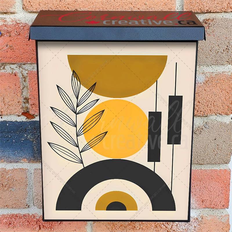 Prettify your Mailbox and your neighborhood with this brilliant Abstract Modern Zen Shapes and Plant Colonial magnetic or self adhesive vinyl Mailbox Cover. Our magnetic covers feature a complete magnetic surface throughout the entire design, unlike lower-quality options that only incorporate two magnet strips combined with a piece of canvas. This ensures better functionality and a more reliable, stronger hold against the wind, also these covers have an additional UV protection, so your covers will not fade for many years. We offer self-adhesive and magnetic covers with both standard opaque vinyl or reflective vinyl options. The reflective mailbox covers function just like license plates and road signs, ensuring excellent visibility during nighttime. No matter the size of your mailbox, we make covers for all box sizes to suit your needs perfectly!
