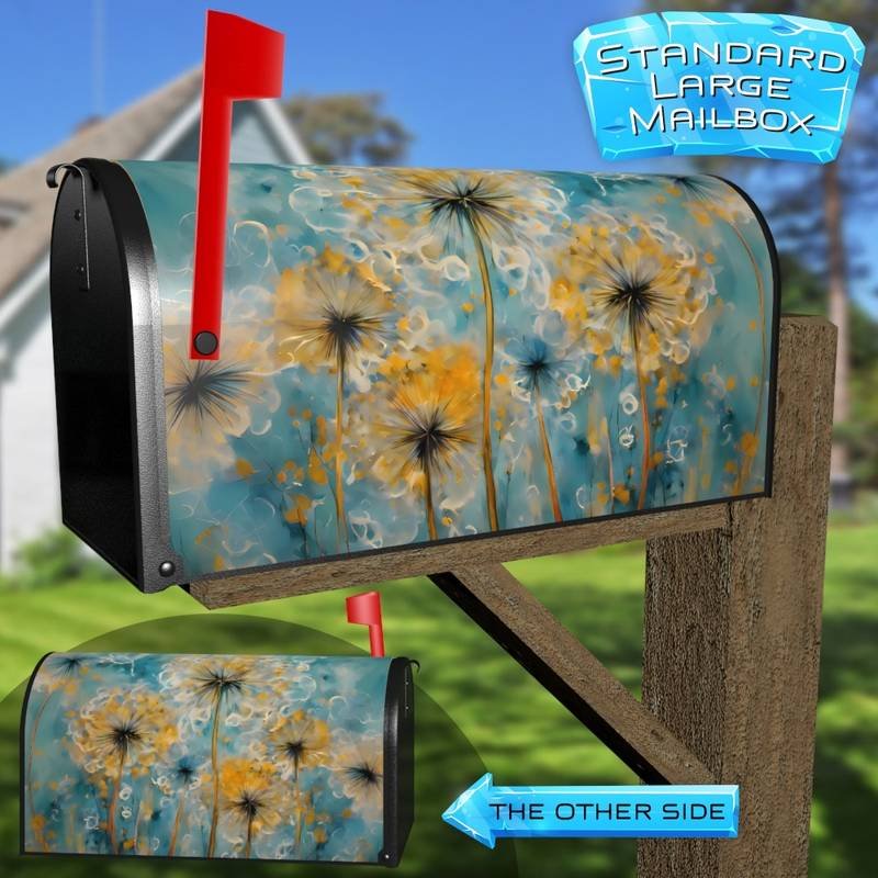 Prettify your Mailbox and your neighborhood with this brilliant Abstract Summer Dandelions curbside / rural / farm magnetic or self adhesive vinyl Mailbox Cover. Our magnetic covers feature a complete magnetic surface throughout the entire design, unlike lower-quality options that only incorporate two magnet strips combined with a piece of canvas. This ensures better functionality and a more reliable, stronger hold against the wind, also these covers have an additional UV protection, so your covers will not fade for many years. We offer self-adhesive and magnetic covers with both standard opaque vinyl or reflective vinyl options. The reflective mailbox covers function just like license plates and road signs, ensuring excellent visibility during nighttime. No matter the size of your mailbox, we make covers for all small, large and jumbo boxes to suit your needs perfectly!