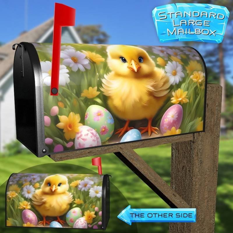 Adorn your Mailbox and your neighborhood with this brilliant Adorable Easter Chick with Eggs curbside / rural / farm magnetic or self adhesive vinyl Mailbox Cover. Our magnetic covers feature a complete magnetic surface throughout the entire design, unlike lower-quality options that only incorporate two magnet strips combined with a piece of canvas. This ensures better functionality and a more reliable, stronger hold against the wind, also these covers have an additional UV protection, so your covers will not fade for many years. We offer self-adhesive and magnetic covers with both standard opaque vinyl or reflective vinyl options. The reflective mailbox covers function just like license plates and road signs, ensuring excellent visibility during nighttime. No matter the size of your mailbox, we make covers for all small, large and jumbo boxes to suit your needs perfectly!