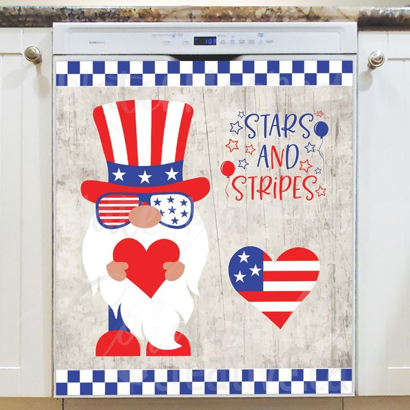 Embellish your kitchen effortlessly with this stunning American Patriot Gnome Magnetic Dishwasher Door Cover! Keep in mind that while this cover works with most dishwashers, some stainless steel and plastic doors might not hold magnets. There are two types of stainless steel: one that attracts magnets well and another that does not, and plastic doors will definitely not work with magnets. So, it is a good idea to test the surface with a magnet before making a purchase. If your dishwasher door is not compatible, consider opting for the Removable Dishwasher Door Sticker instead. Your adorned kitchen will be ready for the season in no time! Keep in mind that this magnetic cover is versatile and can be used on a variety of appliances, including fridges, freezers, washers, dryers, and more!