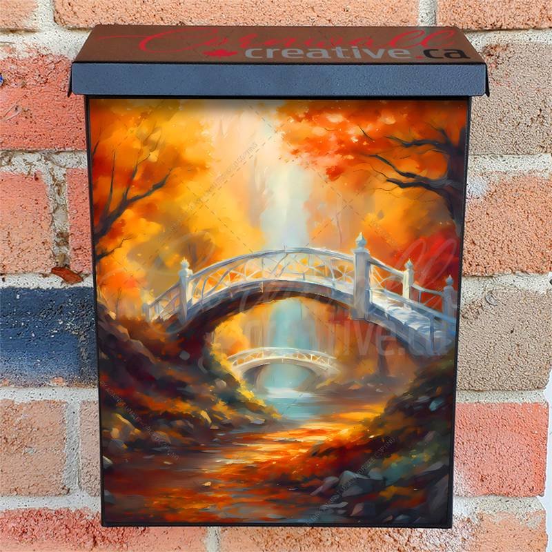 Transform your Mailbox and your neighborhood with this brilliant Autumn Bridge in the Woods Colonial magnetic or self adhesive vinyl Mailbox Cover. Our magnetic covers feature a complete magnetic surface throughout the entire design, unlike lower-quality options that only incorporate two magnet strips combined with a piece of canvas. This ensures better functionality and a more reliable, stronger hold against the wind, also these covers have an additional UV protection, so your covers will not fade for many years. We offer self-adhesive and magnetic covers with both standard opaque vinyl or reflective vinyl options. The reflective mailbox covers function just like license plates and road signs, ensuring excellent visibility during nighttime. No matter the size of your mailbox, we make covers for all box sizes to suit your needs perfectly!
