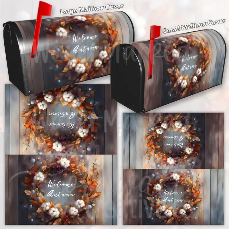 Prettify your Mailbox and your neighborhood with this brilliant Autumn Cotton Flower Wreath curbside / rural / farm magnetic or self adhesive vinyl Mailbox Cover. Our magnetic covers feature a complete magnetic surface throughout the entire design, unlike lower-quality options that only incorporate two magnet strips combined with a piece of canvas. This ensures better functionality and a more reliable, stronger hold against the wind, also these covers have an additional UV protection, so your covers will not fade for many years. We offer self-adhesive and magnetic covers with both standard opaque vinyl or reflective vinyl options. The reflective mailbox covers function just like license plates and road signs, ensuring excellent visibility during nighttime. No matter the size of your mailbox, we make covers for all small, large and jumbo boxes to suit your needs perfectly!
