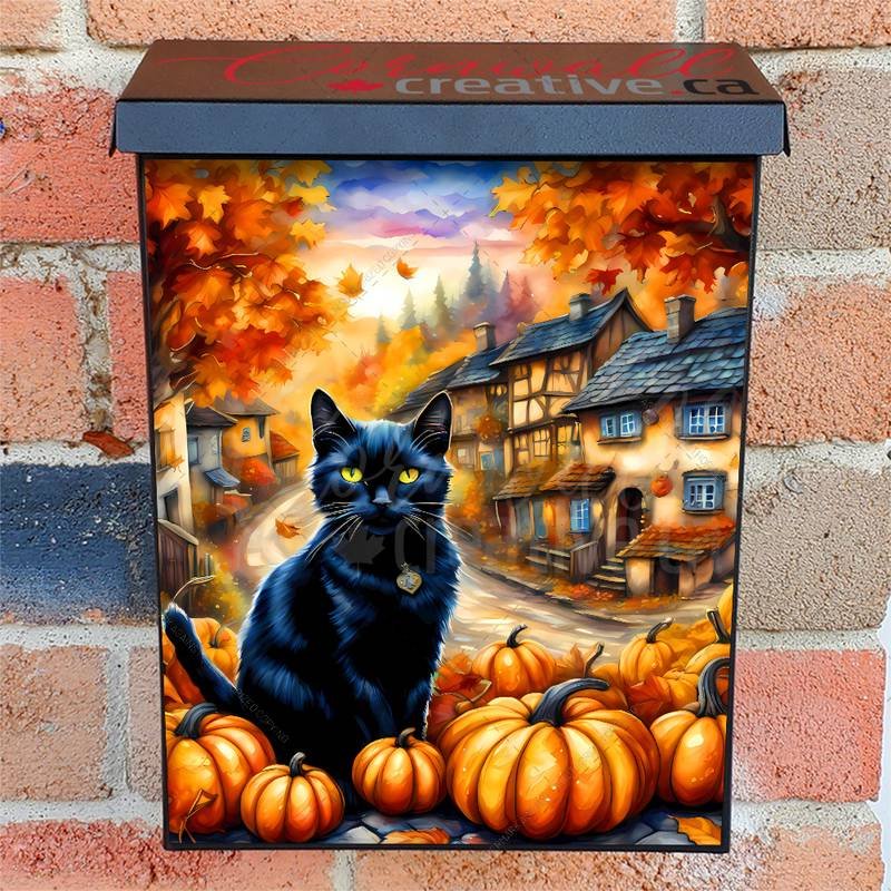 Revamp your Mailbox and your neighborhood with this brilliant Autumn Village and a Black Cat Colonial magnetic or self adhesive vinyl Mailbox Cover. Our magnetic covers feature a complete magnetic surface throughout the entire design, unlike lower-quality options that only incorporate two magnet strips combined with a piece of canvas. This ensures better functionality and a more reliable, stronger hold against the wind, also these covers have an additional UV protection, so your covers will not fade for many years. We offer self-adhesive and magnetic covers with both standard opaque vinyl or reflective vinyl options. The reflective mailbox covers function just like license plates and road signs, ensuring excellent visibility during nighttime. No matter the size of your mailbox, we make covers for all box sizes to suit your needs perfectly!