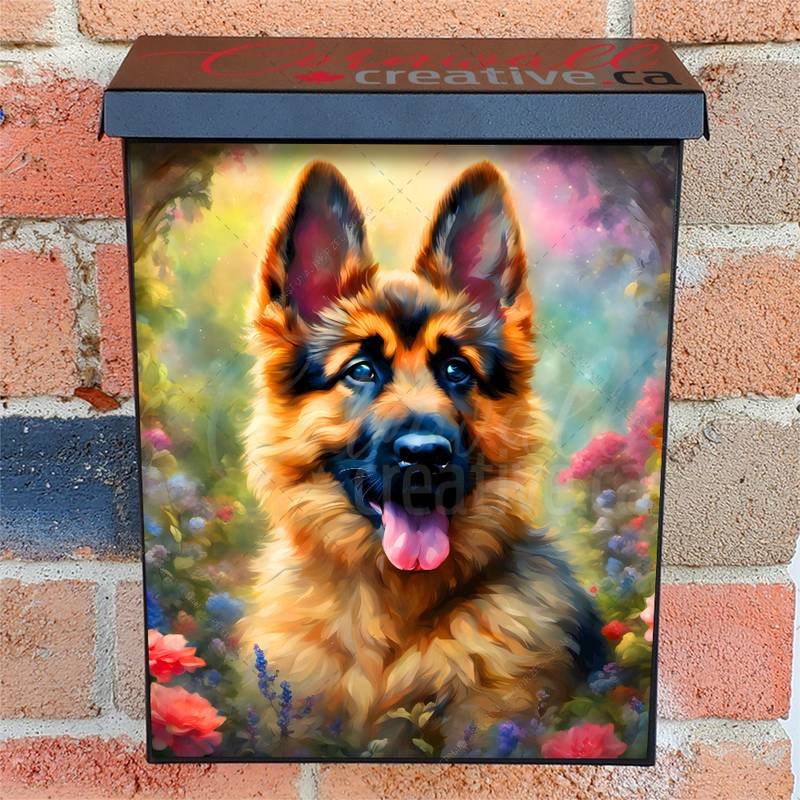 Improve your Mailbox and your neighborhood with this brilliant Baby German Shepherd in the Garden Colonial magnetic or self adhesive vinyl Mailbox Cover. Our magnetic covers feature a complete magnetic surface throughout the entire design, unlike lower-quality options that only incorporate two magnet strips combined with a piece of canvas. This ensures better functionality and a more reliable, stronger hold against the wind, also these covers have an additional UV protection, so your covers will not fade for many years. We offer self-adhesive and magnetic covers with both standard opaque vinyl or reflective vinyl options. The reflective mailbox covers function just like license plates and road signs, ensuring excellent visibility during nighttime. No matter the size of your mailbox, we make covers for all box sizes to suit your needs perfectly!