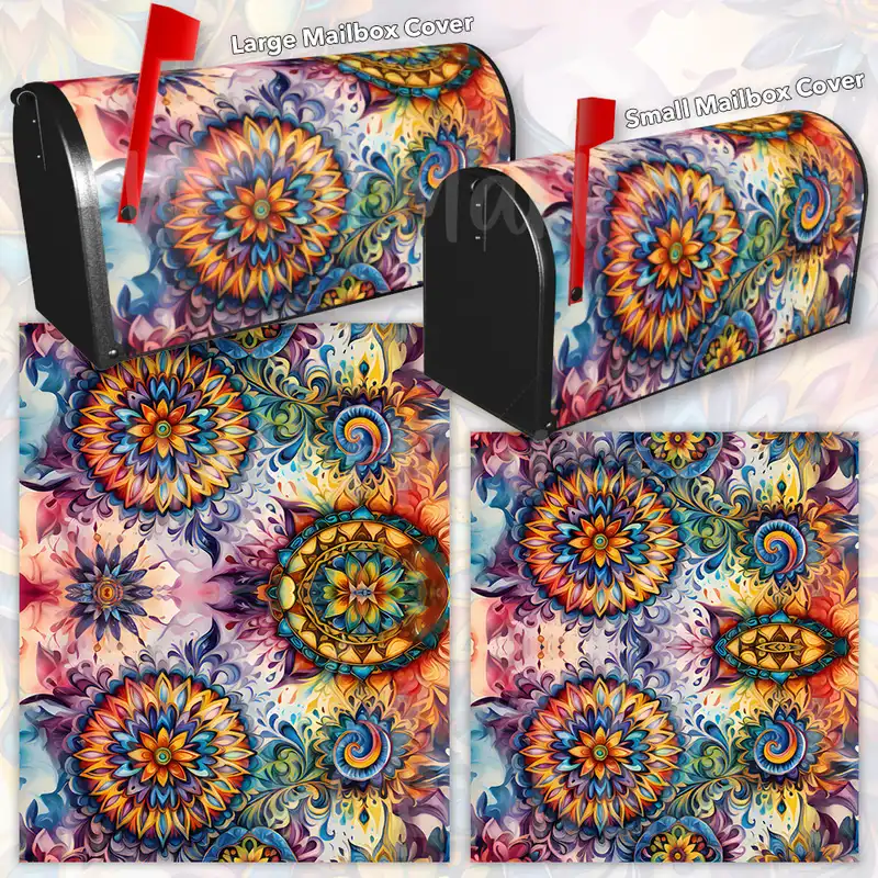 Beautify your Mailbox and your neighborhood with this brilliant Beautiful Abstract Folklore Art curbside / rural / farm magnetic or self adhesive vinyl Mailbox Cover. Our magnetic covers feature a complete magnetic surface throughout the entire design, unlike lower-quality options that only incorporate two magnet strips combined with a piece of canvas. This ensures better functionality and a more reliable, stronger hold against the wind, also these covers have an additional UV protection, so your covers will not fade for many years. We offer self-adhesive and magnetic covers with both standard opaque vinyl or reflective vinyl options. The reflective mailbox covers function just like license plates and road signs, ensuring excellent visibility during nighttime. No matter the size of your mailbox, we make covers for all small, large and jumbo boxes to suit your needs perfectly!