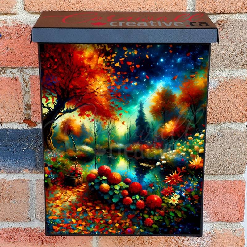 Glamorize your Mailbox and your neighborhood with this brilliant Beautiful Autumn Pond Colonial magnetic or self adhesive vinyl Mailbox Cover. Our magnetic covers feature a complete magnetic surface throughout the entire design, unlike lower-quality options that only incorporate two magnet strips combined with a piece of canvas. This ensures better functionality and a more reliable, stronger hold against the wind, also these covers have an additional UV protection, so your covers will not fade for many years. We offer self-adhesive and magnetic covers with both standard opaque vinyl or reflective vinyl options. The reflective mailbox covers function just like license plates and road signs, ensuring excellent visibility during nighttime. No matter the size of your mailbox, we make covers for all box sizes to suit your needs perfectly!