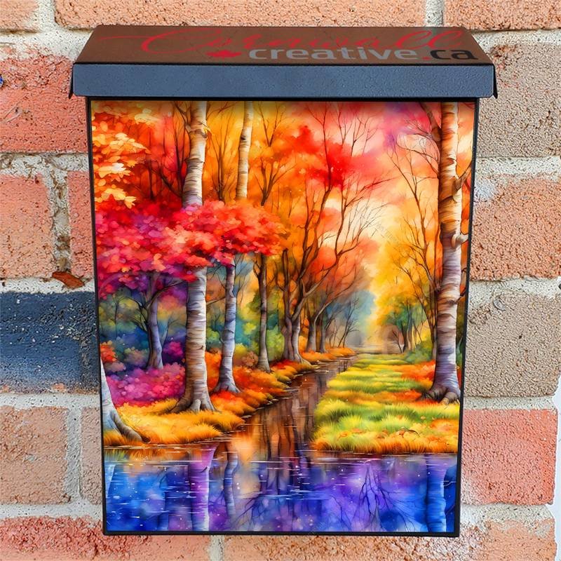 Enhance your Mailbox and your neighborhood with this brilliant Beautiful Forest by the Lake Colonial magnetic or self adhesive vinyl Mailbox Cover. Our magnetic covers feature a complete magnetic surface throughout the entire design, unlike lower-quality options that only incorporate two magnet strips combined with a piece of canvas. This ensures better functionality and a more reliable, stronger hold against the wind, also these covers have an additional UV protection, so your covers will not fade for many years. We offer self-adhesive and magnetic covers with both standard opaque vinyl or reflective vinyl options. The reflective mailbox covers function just like license plates and road signs, ensuring excellent visibility during nighttime. No matter the size of your mailbox, we make covers for all box sizes to suit your needs perfectly!