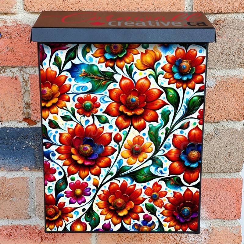 Glamorize your Mailbox and your neighborhood with this brilliant Beautiful Hungarian Floral Pattern Colonial magnetic or self adhesive vinyl Mailbox Cover. Our magnetic covers feature a complete magnetic surface throughout the entire design, unlike lower-quality options that only incorporate two magnet strips combined with a piece of canvas. This ensures better functionality and a more reliable, stronger hold against the wind, also these covers have an additional UV protection, so your covers will not fade for many years. We offer self-adhesive and magnetic covers with both standard opaque vinyl or reflective vinyl options. The reflective mailbox covers function just like license plates and road signs, ensuring excellent visibility during nighttime. No matter the size of your mailbox, we make covers for all box sizes to suit your needs perfectly!