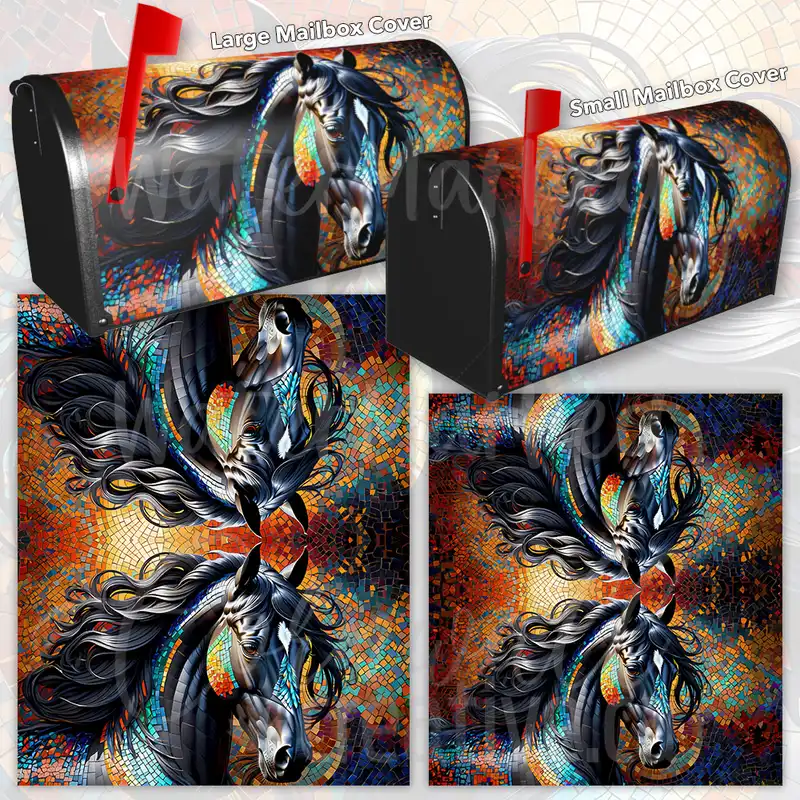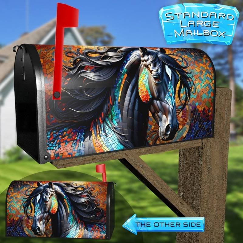 Reform your Mailbox and your neighborhood with this brilliant Beautiful Mosaic Black Stallion curbside / rural / farm magnetic or self adhesive vinyl Mailbox Cover. Our magnetic covers feature a complete magnetic surface throughout the entire design, unlike lower-quality options that only incorporate two magnet strips combined with a piece of canvas. This ensures better functionality and a more reliable, stronger hold against the wind, also these covers have an additional UV protection, so your covers will not fade for many years. We offer self-adhesive and magnetic covers with both standard opaque vinyl or reflective vinyl options. The reflective mailbox covers function just like license plates and road signs, ensuring excellent visibility during nighttime. No matter the size of your mailbox, we make covers for all small, large and jumbo boxes to suit your needs perfectly!