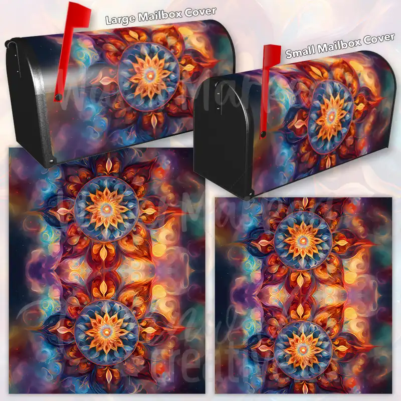 Glamorize your Mailbox and your neighborhood with this brilliant Beautiful Native Mandala Design curbside / rural / farm magnetic or self adhesive vinyl Mailbox Cover. Our magnetic covers feature a complete magnetic surface throughout the entire design, unlike lower-quality options that only incorporate two magnet strips combined with a piece of canvas. This ensures better functionality and a more reliable, stronger hold against the wind, also these covers have an additional UV protection, so your covers will not fade for many years. We offer self-adhesive and magnetic covers with both standard opaque vinyl or reflective vinyl options. The reflective mailbox covers function just like license plates and road signs, ensuring excellent visibility during nighttime. No matter the size of your mailbox, we make covers for all small, large and jumbo boxes to suit your needs perfectly!