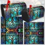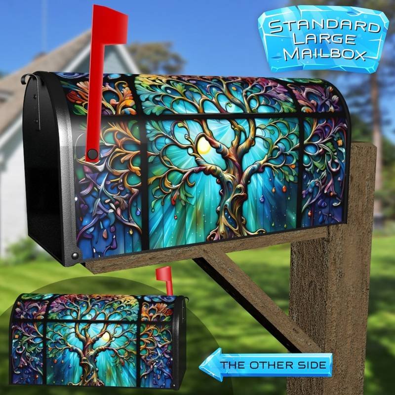 Dress-up your Mailbox and your neighborhood with this brilliant Beautiful Stained Glass Tree curbside / rural / farm magnetic or self adhesive vinyl Mailbox Cover. Our magnetic covers feature a complete magnetic surface throughout the entire design, unlike lower-quality options that only incorporate two magnet strips combined with a piece of canvas. This ensures better functionality and a more reliable, stronger hold against the wind, also these covers have an additional UV protection, so your covers will not fade for many years. We offer self-adhesive and magnetic covers with both standard opaque vinyl or reflective vinyl options. The reflective mailbox covers function just like license plates and road signs, ensuring excellent visibility during nighttime. No matter the size of your mailbox, we make covers for all small, large and jumbo boxes to suit your needs perfectly!