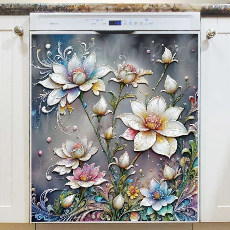 Embellish your kitchen effortlessly with this stunning Beautiful White Whimsical Flowers Magnetic Dishwasher Door Cover! Keep in mind that while this cover works with most dishwashers, some stainless steel and plastic doors might not hold magnets. There are two types of stainless steel: one that attracts magnets well and another that does not, and plastic doors will definitely not work with magnets. So, it is a good idea to test the surface with a magnet before making a purchase. If your dishwasher door is not compatible, consider opting for the Removable Dishwasher Door Sticker instead. Your spruced up kitchen will be ready for the season in no time! Keep in mind that this magnetic cover is versatile and can be used on a variety of appliances, including fridges, freezers, washers, dryers, and more!
