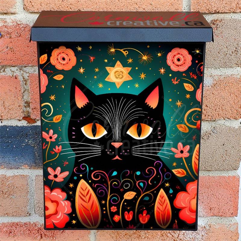 Gussy up your Mailbox and your neighborhood with this brilliant Black Folklore Cat Colonial magnetic or self adhesive vinyl Mailbox Cover. Our magnetic covers feature a complete magnetic surface throughout the entire design, unlike lower-quality options that only incorporate two magnet strips combined with a piece of canvas. This ensures better functionality and a more reliable, stronger hold against the wind, also these covers have an additional UV protection, so your covers will not fade for many years. We offer self-adhesive and magnetic covers with both standard opaque vinyl or reflective vinyl options. The reflective mailbox covers function just like license plates and road signs, ensuring excellent visibility during nighttime. No matter the size of your mailbox, we make covers for all box sizes to suit your needs perfectly!