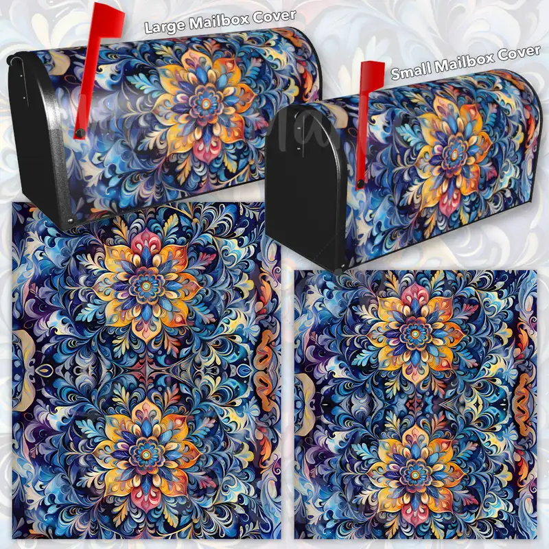 Revamp your Mailbox and your neighborhood with this brilliant Blue and Yellow Mandala curbside / rural / farm magnetic or self adhesive vinyl Mailbox Cover. Our magnetic covers feature a complete magnetic surface throughout the entire design, unlike lower-quality options that only incorporate two magnet strips combined with a piece of canvas. This ensures better functionality and a more reliable, stronger hold against the wind, also these covers have an additional UV protection, so your covers will not fade for many years. We offer self-adhesive and magnetic covers with both standard opaque vinyl or reflective vinyl options. The reflective mailbox covers function just like license plates and road signs, ensuring excellent visibility during nighttime. No matter the size of your mailbox, we make covers for all small, large and jumbo boxes to suit your needs perfectly!