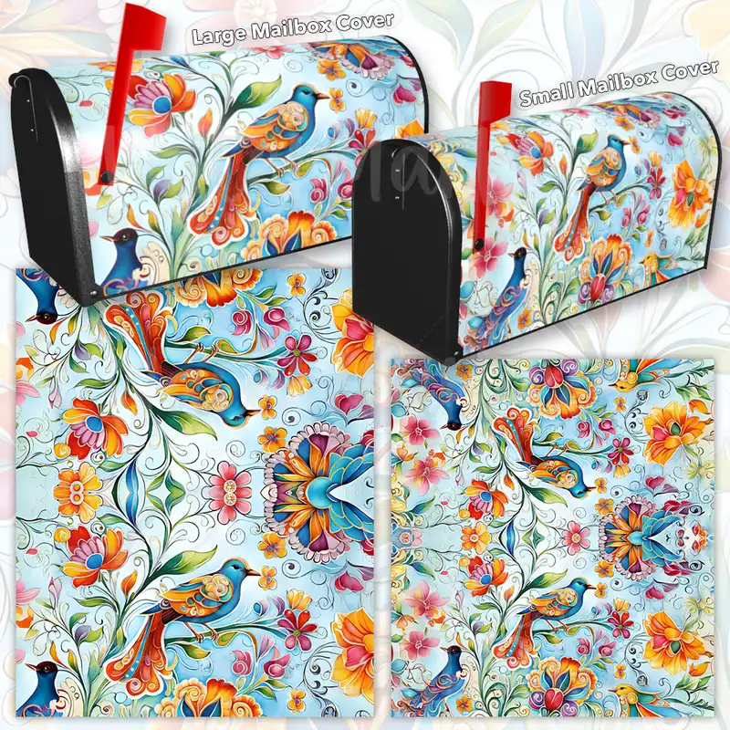 Revamp your Mailbox and your neighborhood with this brilliant Boho Flowers and Birds curbside / rural / farm magnetic or self adhesive vinyl Mailbox Cover. Our magnetic covers feature a complete magnetic surface throughout the entire design, unlike lower-quality options that only incorporate two magnet strips combined with a piece of canvas. This ensures better functionality and a more reliable, stronger hold against the wind, also these covers have an additional UV protection, so your covers will not fade for many years. We offer self-adhesive and magnetic covers with both standard opaque vinyl or reflective vinyl options. The reflective mailbox covers function just like license plates and road signs, ensuring excellent visibility during nighttime. No matter the size of your mailbox, we make covers for all small, large and jumbo boxes to suit your needs perfectly!