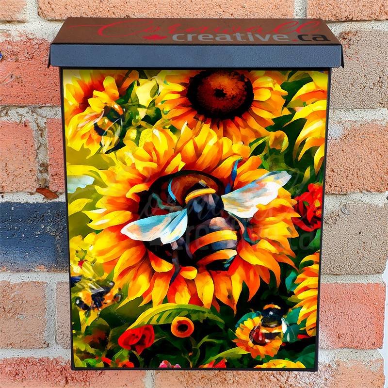 Lift your Mailbox and your neighborhood with this brilliant Bumblebees and Sunflowers #2 Colonial magnetic or self adhesive vinyl Mailbox Cover. Our magnetic covers feature a complete magnetic surface throughout the entire design, unlike lower-quality options that only incorporate two magnet strips combined with a piece of canvas. This ensures better functionality and a more reliable, stronger hold against the wind, also these covers have an additional UV protection, so your covers will not fade for many years. We offer self-adhesive and magnetic covers with both standard opaque vinyl or reflective vinyl options. The reflective mailbox covers function just like license plates and road signs, ensuring excellent visibility during nighttime. No matter the size of your mailbox, we make covers for all box sizes to suit your needs perfectly!