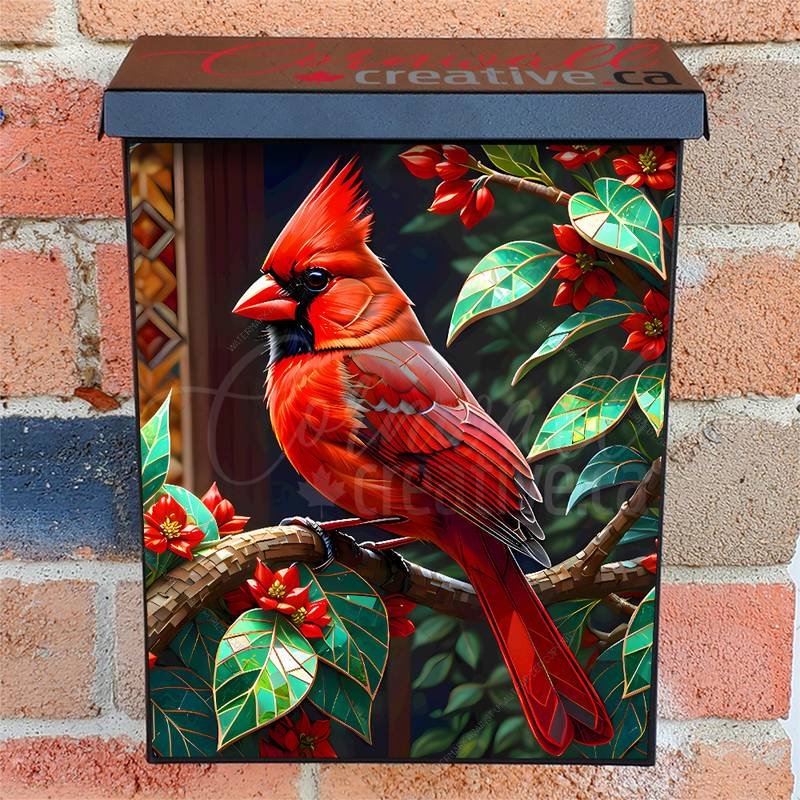 Glamorize your Mailbox and your neighborhood with this brilliant Cardinal on a Mosaic Tree Colonial magnetic or self adhesive vinyl Mailbox Cover. Our magnetic covers feature a complete magnetic surface throughout the entire design, unlike lower-quality options that only incorporate two magnet strips combined with a piece of canvas. This ensures better functionality and a more reliable, stronger hold against the wind, also these covers have an additional UV protection, so your covers will not fade for many years. We offer self-adhesive and magnetic covers with both standard opaque vinyl or reflective vinyl options. The reflective mailbox covers function just like license plates and road signs, ensuring excellent visibility during nighttime. No matter the size of your mailbox, we make covers for all box sizes to suit your needs perfectly!