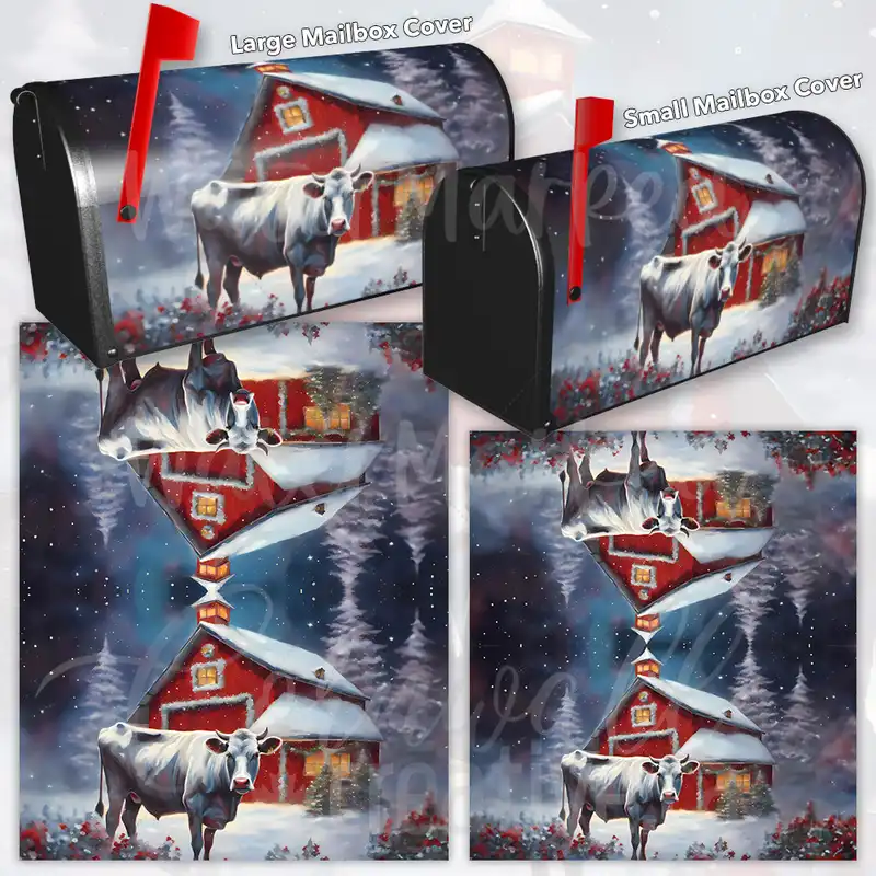 Improve your Mailbox and your neighborhood with this brilliant Christmas Farmhouse Cow and Barn curbside / rural / farm magnetic or self adhesive vinyl Mailbox Cover. Our magnetic covers feature a complete magnetic surface throughout the entire design, unlike lower-quality options that only incorporate two magnet strips combined with a piece of canvas. This ensures better functionality and a more reliable, stronger hold against the wind, also these covers have an additional UV protection, so your covers will not fade for many years. We offer self-adhesive and magnetic covers with both standard opaque vinyl or reflective vinyl options. The reflective mailbox covers function just like license plates and road signs, ensuring excellent visibility during nighttime. No matter the size of your mailbox, we make covers for all small, large and jumbo boxes to suit your needs perfectly!