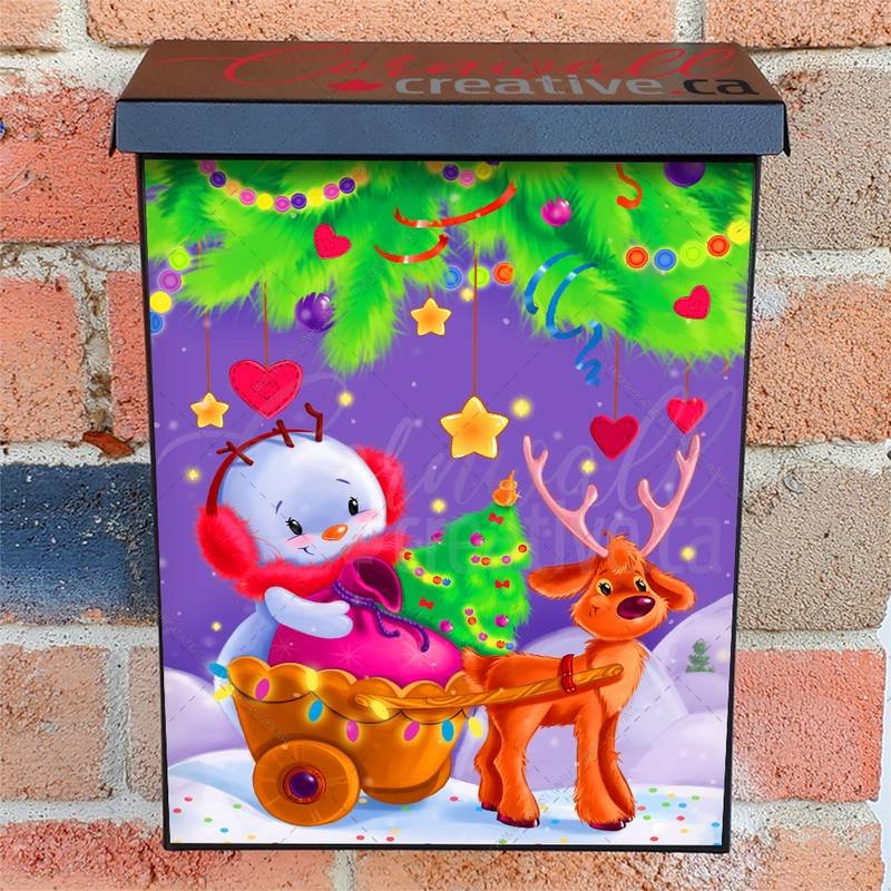 Prettify your Mailbox and your neighborhood with this brilliant Christmas Snowman and Reindeer Colonial magnetic or self adhesive vinyl Mailbox Cover. Our magnetic covers feature a complete magnetic surface throughout the entire design, unlike lower-quality options that only incorporate two magnet strips combined with a piece of canvas. This ensures better functionality and a more reliable, stronger hold against the wind, also these covers have an additional UV protection, so your covers will not fade for many years. We offer self-adhesive and magnetic covers with both standard opaque vinyl or reflective vinyl options. The reflective mailbox covers function just like license plates and road signs, ensuring excellent visibility during nighttime. No matter the size of your mailbox, we make covers for all box sizes to suit your needs perfectly!
