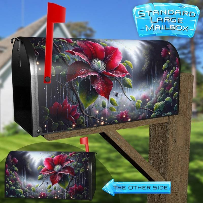 Glamorize your Mailbox and your neighborhood with this brilliant Clematis Flowers and Fireflies curbside / rural / farm magnetic or self adhesive vinyl Mailbox Cover. Our magnetic covers feature a complete magnetic surface throughout the entire design, unlike lower-quality options that only incorporate two magnet strips combined with a piece of canvas. This ensures better functionality and a more reliable, stronger hold against the wind, also these covers have an additional UV protection, so your covers will not fade for many years. We offer self-adhesive and magnetic covers with both standard opaque vinyl or reflective vinyl options. The reflective mailbox covers function just like license plates and road signs, ensuring excellent visibility during nighttime. No matter the size of your mailbox, we make covers for all small, large and jumbo boxes to suit your needs perfectly!