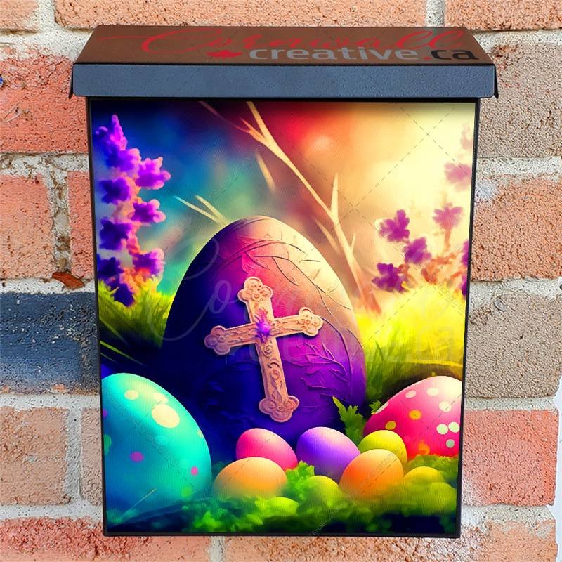 Spruce up your Mailbox and your neighborhood with this brilliant Colorful Easter Eggs and a Cross Colonial magnetic or self adhesive vinyl Mailbox Cover. Our magnetic covers feature a complete magnetic surface throughout the entire design, unlike lower-quality options that only incorporate two magnet strips combined with a piece of canvas. This ensures better functionality and a more reliable, stronger hold against the wind, also these covers have an additional UV protection, so your covers will not fade for many years. We offer self-adhesive and magnetic covers with both standard opaque vinyl or reflective vinyl options. The reflective mailbox covers function just like license plates and road signs, ensuring excellent visibility during nighttime. No matter the size of your mailbox, we make covers for all box sizes to suit your needs perfectly!
