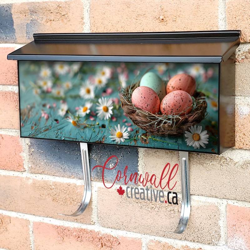 Applying your Colorful Easter Eggs In A Basket With White Flowers wall-mounted townhouse / ranch mailbox cover it is pretty easy to decorate your mailbox to a special and unique item. These covers require a flat surface, so they work with townhouse / ranch mailboxes that do not have any embossed / debossed decoration or signs. Magnetic mailbox covers work with steel boxes only, for aluminum and plastic boxes we offer the self-adhesive vinyl covers. Also, you can create your custom townhouse / ranch mailbox cover using you own pictures, adding your name, street number, etc. Our magnetic covers feature a complete magnetic surface throughout the entire design, unlike lower-quality options that only incorporate two magnet strips combined with a piece of canvas. This ensures better functionality and a more reliable, stronger hold against the wind, also these covers have an additional UV protection, so your covers will not fade for many years. The reflective mailbox covers function just like license plates and road signs, ensuring excellent visibility during nighttime.