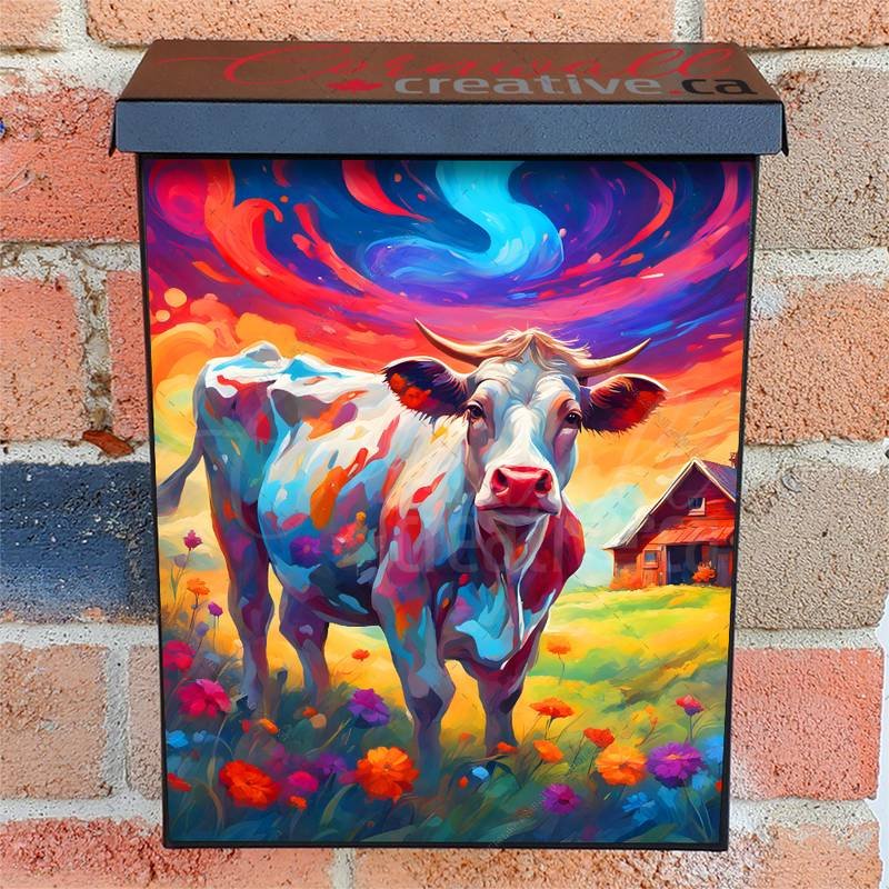 Embellish your Mailbox and your neighborhood with this brilliant Colorful Farmhouse Cow Colonial magnetic or self adhesive vinyl Mailbox Cover. Our magnetic covers feature a complete magnetic surface throughout the entire design, unlike lower-quality options that only incorporate two magnet strips combined with a piece of canvas. This ensures better functionality and a more reliable, stronger hold against the wind, also these covers have an additional UV protection, so your covers will not fade for many years. We offer self-adhesive and magnetic covers with both standard opaque vinyl or reflective vinyl options. The reflective mailbox covers function just like license plates and road signs, ensuring excellent visibility during nighttime. No matter the size of your mailbox, we make covers for all box sizes to suit your needs perfectly!