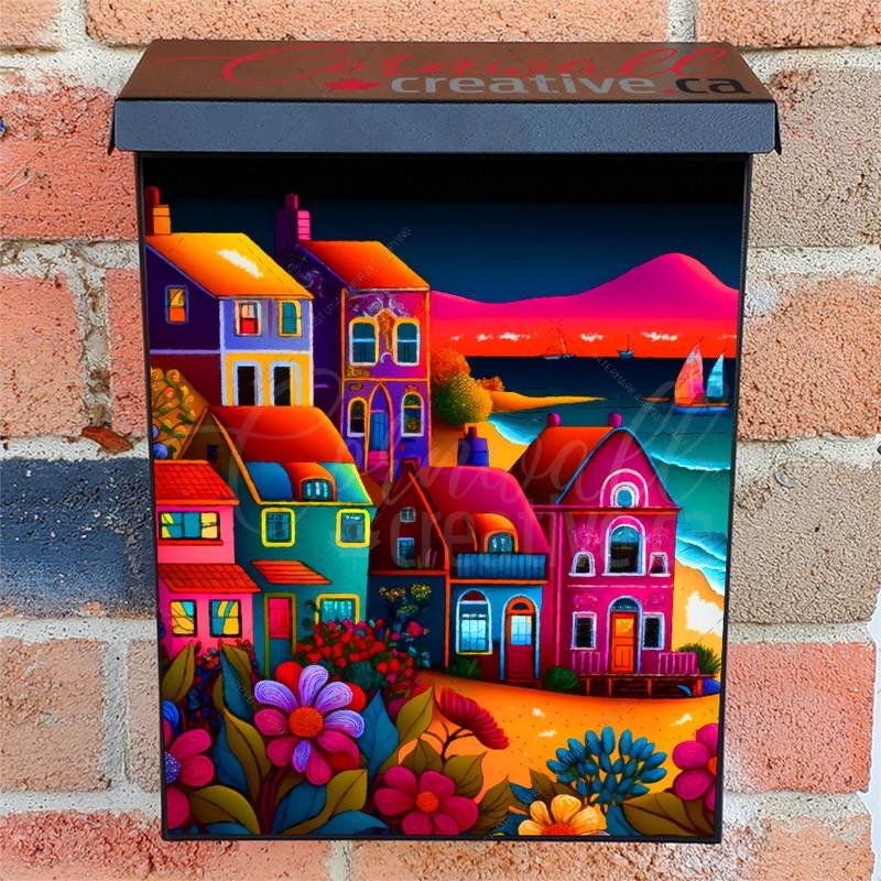 Lift your Mailbox and your neighborhood with this brilliant Colorful Seaside Village #2 Colonial magnetic or self adhesive vinyl Mailbox Cover. Our magnetic covers feature a complete magnetic surface throughout the entire design, unlike lower-quality options that only incorporate two magnet strips combined with a piece of canvas. This ensures better functionality and a more reliable, stronger hold against the wind, also these covers have an additional UV protection, so your covers will not fade for many years. We offer self-adhesive and magnetic covers with both standard opaque vinyl or reflective vinyl options. The reflective mailbox covers function just like license plates and road signs, ensuring excellent visibility during nighttime. No matter the size of your mailbox, we make covers for all box sizes to suit your needs perfectly!