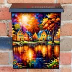 Adorn your Mailbox and your neighborhood with this brilliant Cozy Autumn Village by the Lake Colonial magnetic or self adhesive vinyl Mailbox Cover. Our magnetic covers feature a complete magnetic surface throughout the entire design, unlike lower-quality options that only incorporate two magnet strips combined with a piece of canvas. This ensures better functionality and a more reliable, stronger hold against the wind, also these covers have an additional UV protection, so your covers will not fade for many years. We offer self-adhesive and magnetic covers with both standard opaque vinyl or reflective vinyl options. The reflective mailbox covers function just like license plates and road signs, ensuring excellent visibility during nighttime. No matter the size of your mailbox, we make covers for all box sizes to suit your needs perfectly!