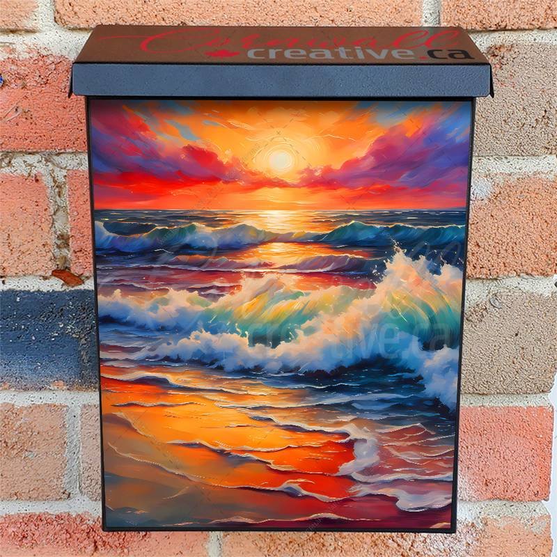 Spruce up your Mailbox and your neighborhood with this brilliant Crashing Waves at the Beach Colonial magnetic or self adhesive vinyl Mailbox Cover. Our magnetic covers feature a complete magnetic surface throughout the entire design, unlike lower-quality options that only incorporate two magnet strips combined with a piece of canvas. This ensures better functionality and a more reliable, stronger hold against the wind, also these covers have an additional UV protection, so your covers will not fade for many years. We offer self-adhesive and magnetic covers with both standard opaque vinyl or reflective vinyl options. The reflective mailbox covers function just like license plates and road signs, ensuring excellent visibility during nighttime. No matter the size of your mailbox, we make covers for all box sizes to suit your needs perfectly!