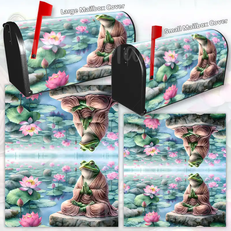 Lift your Mailbox and your neighborhood with this brilliant Cute Frog Buddha curbside / rural / farm magnetic or self adhesive vinyl Mailbox Cover. Our magnetic covers feature a complete magnetic surface throughout the entire design, unlike lower-quality options that only incorporate two magnet strips combined with a piece of canvas. This ensures better functionality and a more reliable, stronger hold against the wind, also these covers have an additional UV protection, so your covers will not fade for many years. We offer self-adhesive and magnetic covers with both standard opaque vinyl or reflective vinyl options. The reflective mailbox covers function just like license plates and road signs, ensuring excellent visibility during nighttime. No matter the size of your mailbox, we make covers for all small, large and jumbo boxes to suit your needs perfectly!