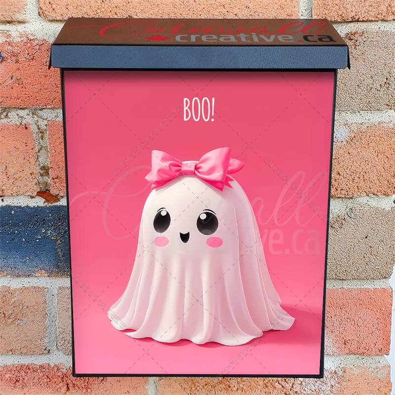 Beautify your Mailbox and your neighborhood with this brilliant Cute Halloween Ghost with a Pink Bow Colonial magnetic or self adhesive vinyl Mailbox Cover. Our magnetic covers feature a complete magnetic surface throughout the entire design, unlike lower-quality options that only incorporate two magnet strips combined with a piece of canvas. This ensures better functionality and a more reliable, stronger hold against the wind, also these covers have an additional UV protection, so your covers will not fade for many years. We offer self-adhesive and magnetic covers with both standard opaque vinyl or reflective vinyl options. The reflective mailbox covers function just like license plates and road signs, ensuring excellent visibility during nighttime. No matter the size of your mailbox, we make covers for all box sizes to suit your needs perfectly!