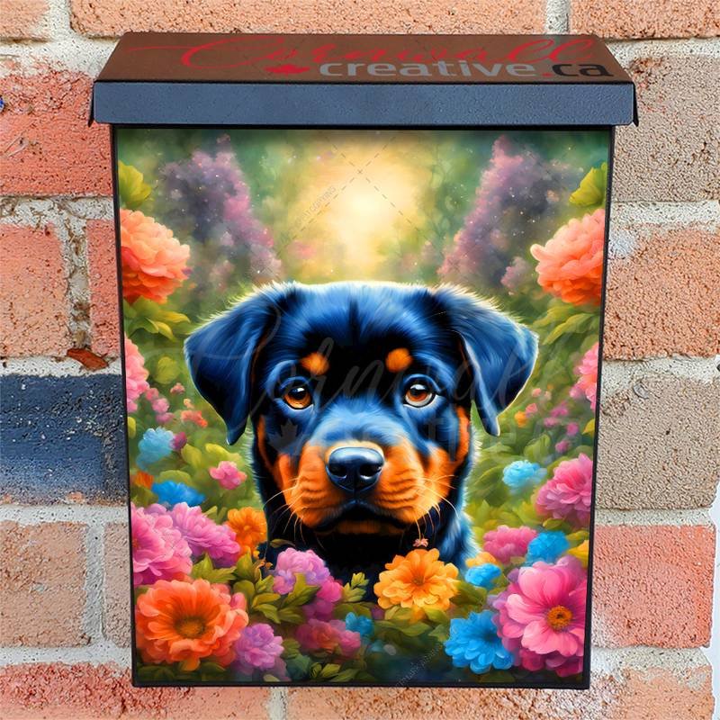Gussy up your Mailbox and your neighborhood with this brilliant Cute Rottweiler Puppy in the Garden Colonial magnetic or self adhesive vinyl Mailbox Cover. Our magnetic covers feature a complete magnetic surface throughout the entire design, unlike lower-quality options that only incorporate two magnet strips combined with a piece of canvas. This ensures better functionality and a more reliable, stronger hold against the wind, also these covers have an additional UV protection, so your covers will not fade for many years. We offer self-adhesive and magnetic covers with both standard opaque vinyl or reflective vinyl options. The reflective mailbox covers function just like license plates and road signs, ensuring excellent visibility during nighttime. No matter the size of your mailbox, we make covers for all box sizes to suit your needs perfectly!