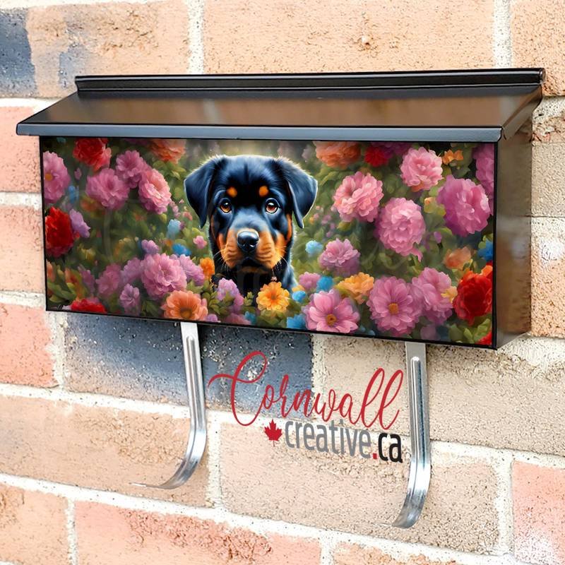 Applying your Cute Rottweiler Puppy in the Garden wall-mounted townhouse / ranch mailbox cover it is pretty easy to adorn your mailbox to a special and unique item. These covers require a flat surface, so they work with townhouse / ranch mailboxes that do not have any embossed / debossed decoration or signs. Magnetic mailbox covers work with steel boxes only, for aluminum and plastic boxes we offer the self-adhesive vinyl covers. Also, you can create your custom townhouse / ranch mailbox cover using you own pictures, adding your name, street number, etc. Our magnetic covers feature a complete magnetic surface throughout the entire design, unlike lower-quality options that only incorporate two magnet strips combined with a piece of canvas. This ensures better functionality and a more reliable, stronger hold against the wind, also these covers have an additional UV protection, so your covers will not fade for many years. The reflective mailbox covers function just like license plates and road signs, ensuring excellent visibility during nighttime.