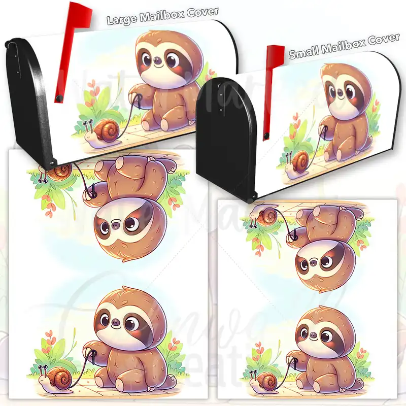 Decorate your Mailbox and your neighborhood with this brilliant Cute Sloth and His Pet Snail curbside / rural / farm magnetic or self adhesive vinyl Mailbox Cover. Our magnetic covers feature a complete magnetic surface throughout the entire design, unlike lower-quality options that only incorporate two magnet strips combined with a piece of canvas. This ensures better functionality and a more reliable, stronger hold against the wind, also these covers have an additional UV protection, so your covers will not fade for many years. We offer self-adhesive and magnetic covers with both standard opaque vinyl or reflective vinyl options. The reflective mailbox covers function just like license plates and road signs, ensuring excellent visibility during nighttime. No matter the size of your mailbox, we make covers for all small, large and jumbo boxes to suit your needs perfectly!