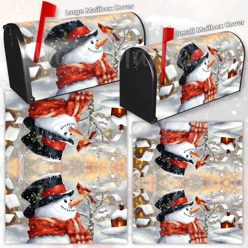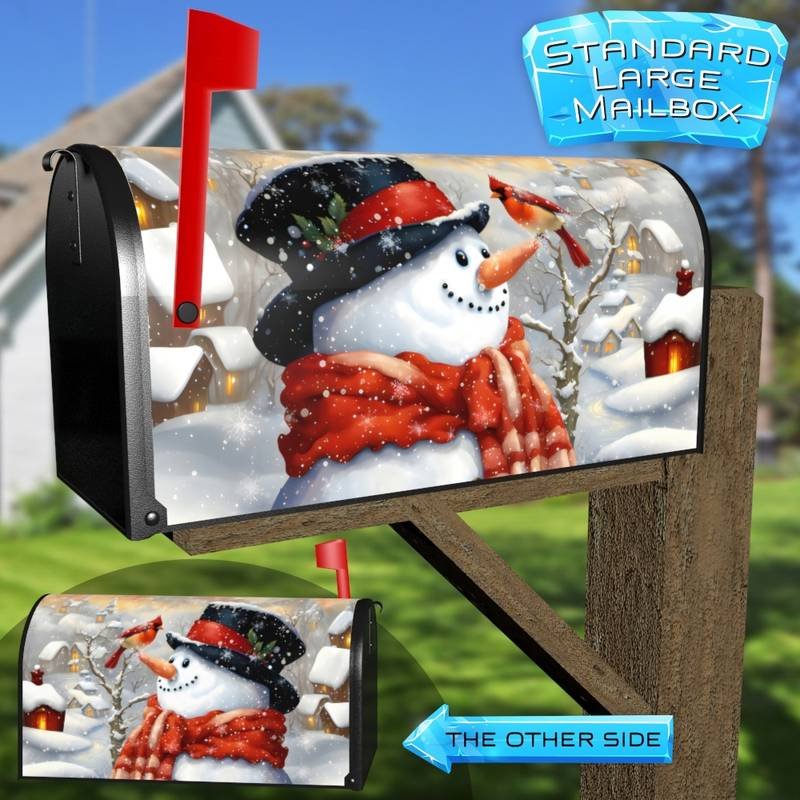 Lift your Mailbox and your neighborhood with this brilliant Cute Snowman with a Cardinal curbside / rural / farm magnetic or self adhesive vinyl Mailbox Cover. Our magnetic covers feature a complete magnetic surface throughout the entire design, unlike lower-quality options that only incorporate two magnet strips combined with a piece of canvas. This ensures better functionality and a more reliable, stronger hold against the wind, also these covers have an additional UV protection, so your covers will not fade for many years. We offer self-adhesive and magnetic covers with both standard opaque vinyl or reflective vinyl options. The reflective mailbox covers function just like license plates and road signs, ensuring excellent visibility during nighttime. No matter the size of your mailbox, we make covers for all small, large and jumbo boxes to suit your needs perfectly!